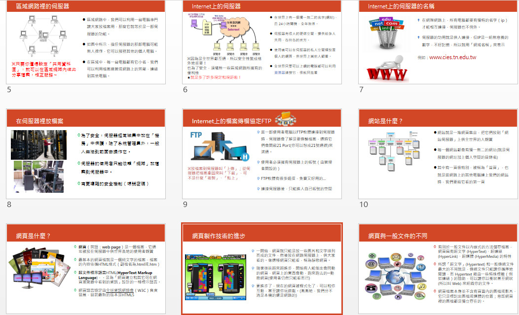 第二段課程就比較動腦了,老師指導大家從網路的形成概念進入學習,了解區域網路及廣域網路的不同,也對伺服器這種功能的電腦及FTP服務及HTTP有了進一步的概念,這在未來我們開始要製作網頁上傳都會用到的技能知識,過程中,我們也進行了實作練習…