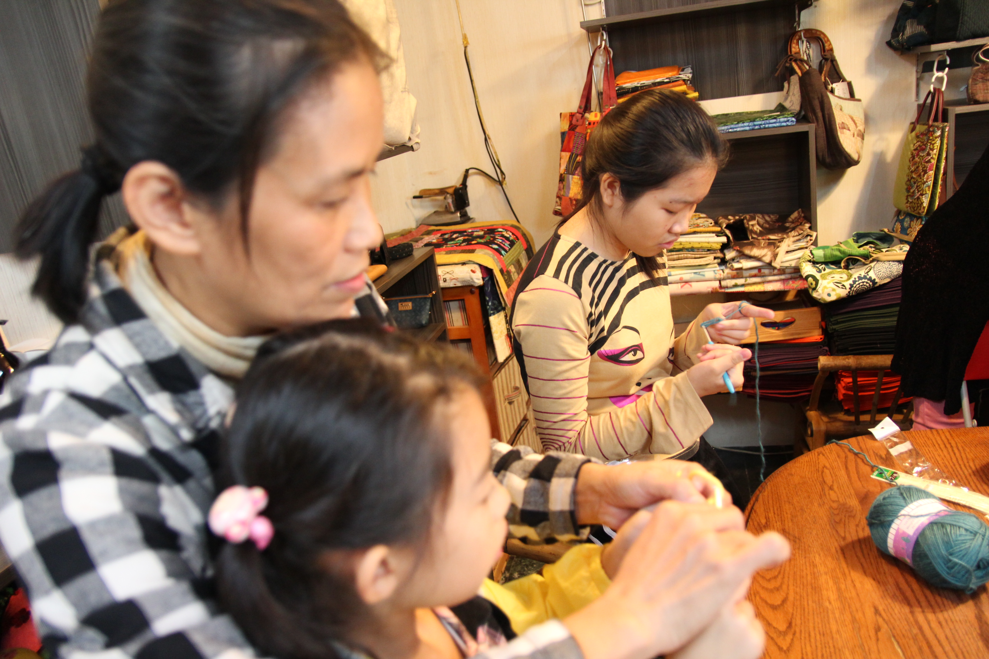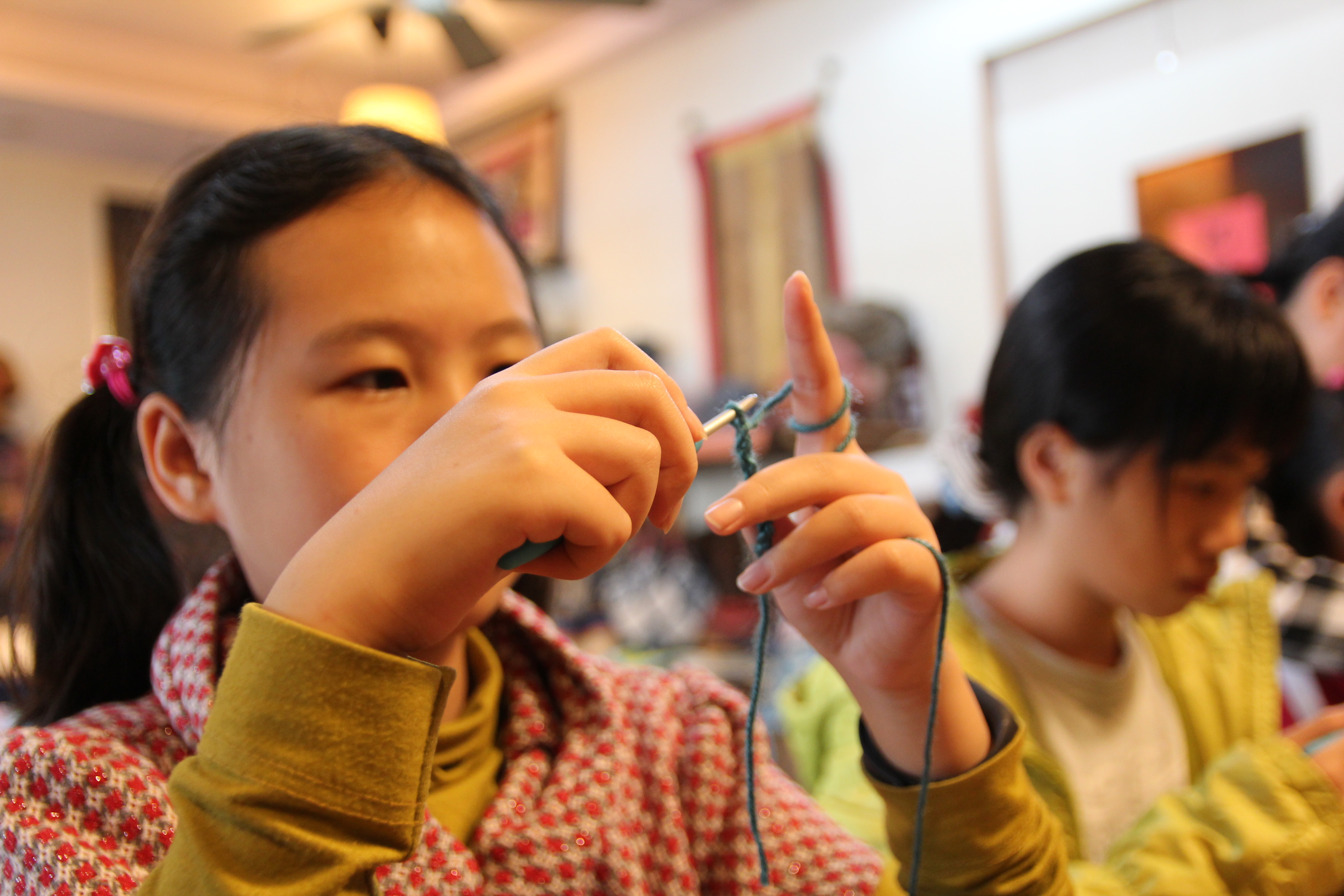 一進到茶布屋,店內擺滿了邱阿姨手做的飾品,主要以毛線編織和拼布為大宗,雖然沒機會問阿姨問題,但是我覺得邱阿姨一定很喜歡做這些手工藝,才會把興趣作為謀生的工具。一開始邱阿姨請我們每個人都選擇一個毛線球,並且拿一隻勾針,邱阿姨特別強調這隻勾針是從日本坐飛機過來的,很好用要特別去愛惜它。接著,邱阿姨教我們一開始的「鎖針」,我們大概花了快30分鐘才慢慢熟練鎖針的打法,不過這只不過打了一條線而已,距離我們的目標-圍巾,還有一大段距離。接著,邱阿姨再教我們成面的「短針」,我們只練了一下下就要回學校上課了,不過邱阿姨說,我們只要有問題隨時可以回去找她幫忙,若是要學更高級的打法,她也會毫不吝嗇的教我們。我覺得打毛線真的需要耐心,跟是男生或女生沒有完全的相關,隊員裡面有好幾個男生,打起來也挺有架式的。
