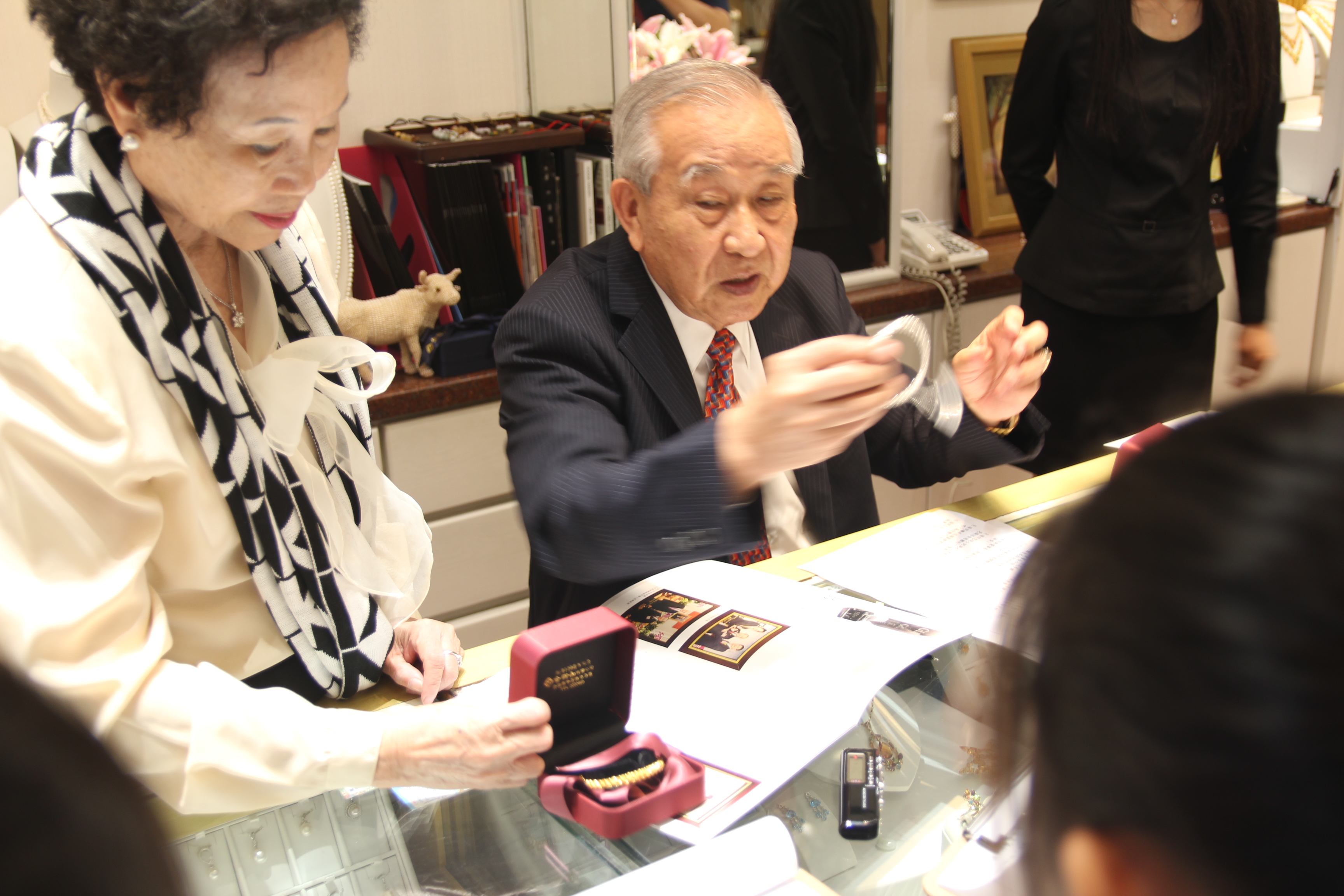 接著,我們一行人便浩浩蕩蕩往金樹山前進,一進金樹山便看到許勝三董事長賢伉儷在門口迎接我們。隊長說明我們的來意以及介紹完隊員後,便請許董事長填寫智慧財產權授權書,但是基於安全考量,婉拒授權我們將蒐集的資料做成網頁,不過許董事長仍然很歡迎我們來參訪。所以,老師臨時將今天的訪談改成,「大開眼界」的參訪會,訪談程序仍然照常進行,只是比較沒有壓力。訪談結束,許董事長邀請我們大合照,並送我們聖誕禮物,此次參訪真是行囊滿滿的回來。畢竟,金樹山是屬於比較特殊的珠寶業,為了避免後續發生問題,我們能體諒許董事長的決定,所以本次主題「金讚工藝永流傳 台灣第一金仔店~金樹山」到此結束。