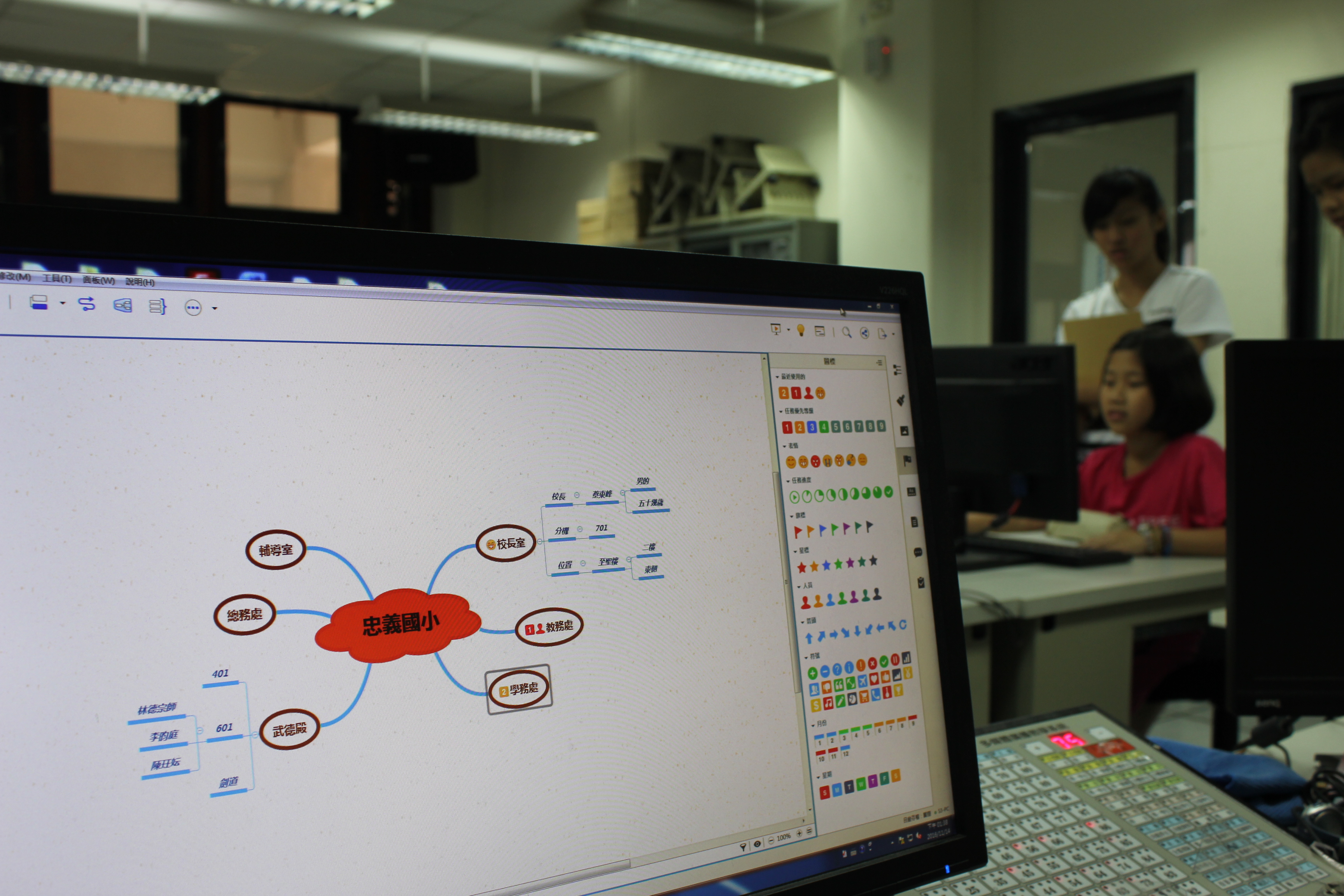 老師要大家一起用個簡單的主題「忠義國小」來做個練習,我們發現只要會「Enter」、「Insert」二個按鈕,幾乎就會了,困難的地方應該是我們的想法吧!針對一個主題,我們該如何用放射性的思考方式來想呢?