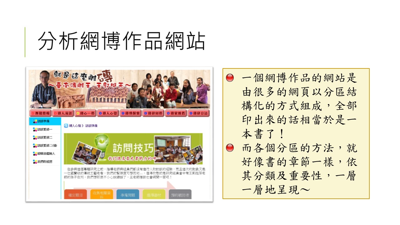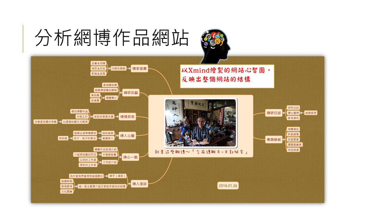 很快的,大家都學會了Xmind的基本操作,接下來老師說明如何用心智圖去分析已存在的網站作品,老師以上屆我們自己的作品「台南磚雕王~王郭挺芳」來舉例,利用心智圖可以畫出這個內容複雜的網站的結構…,畫出心智圖後,想法就會清楚了,而且去分析別人的好作品也可以刺激自己的想法,用於我們接下來的作品中。