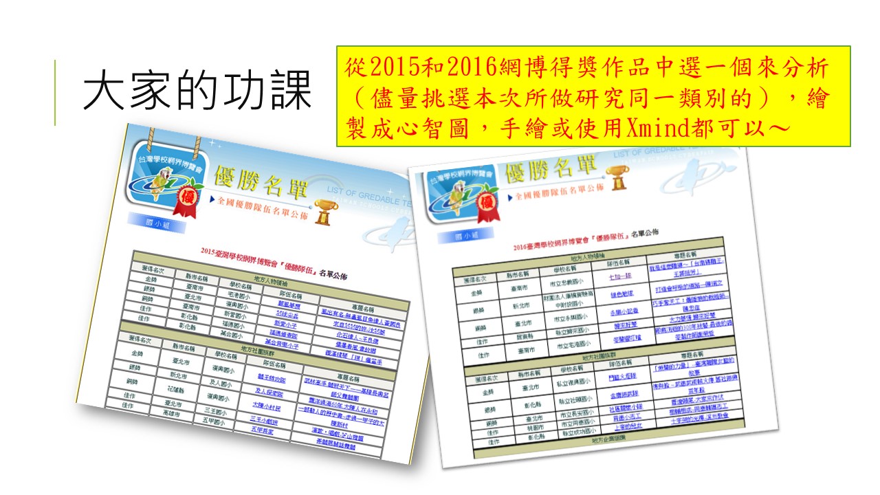 派個作業給大家囉!老師要求每個人從2015~2016之間網界博覽會得獎的作品,挑一個來分析,運用Xmind把結構給畫出來!