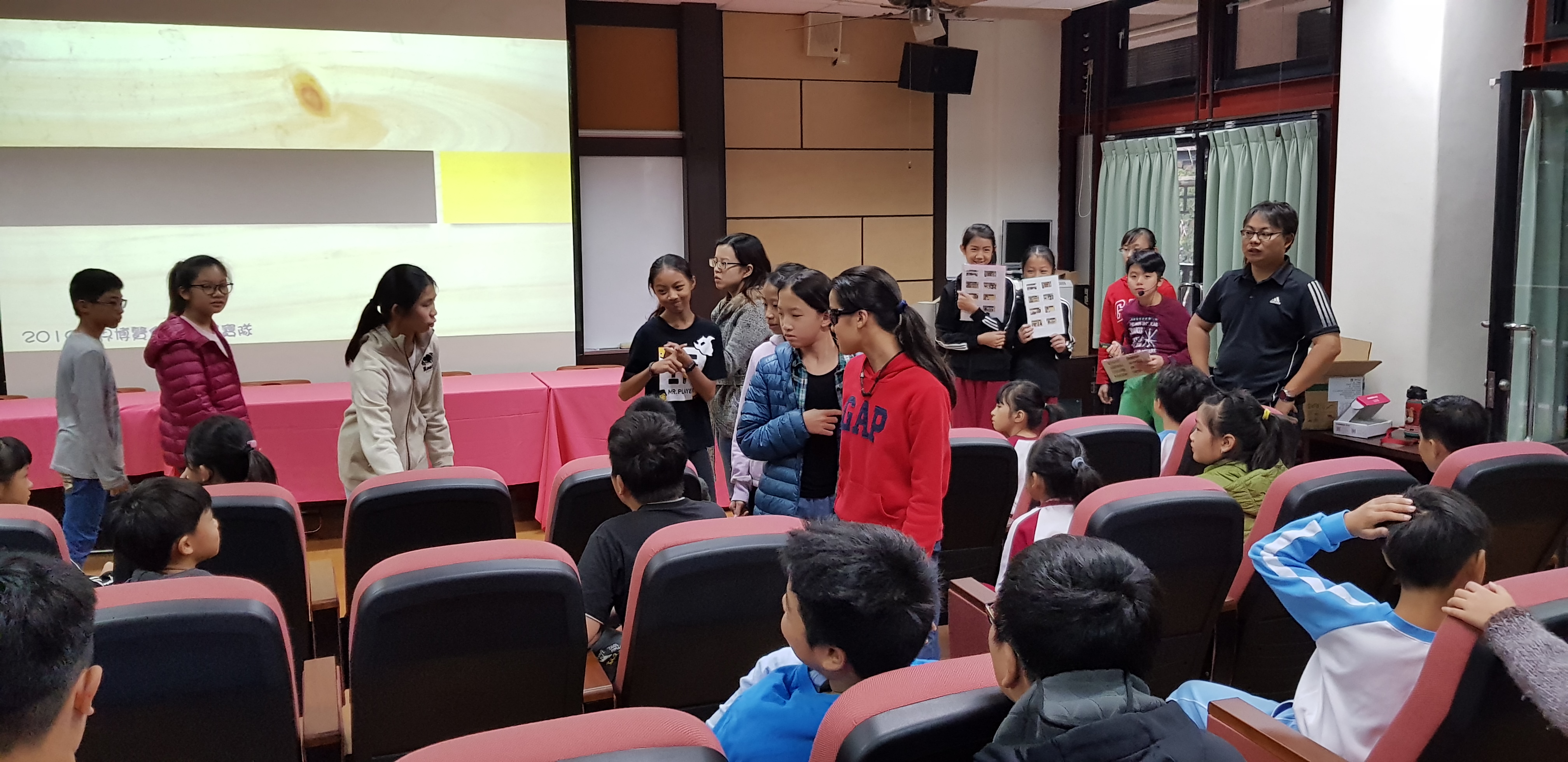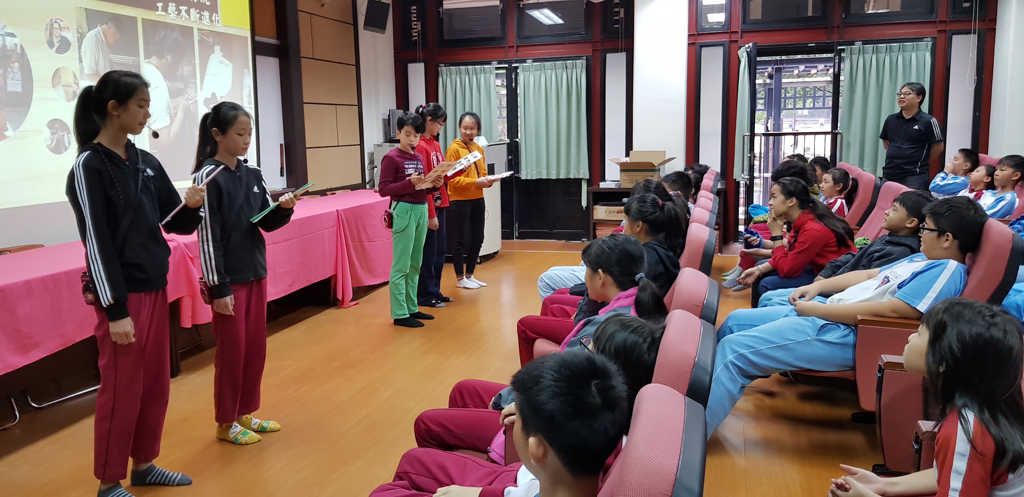 六年級的簡報任務排在第二波進行,我們一樣邀請了好幾個班級把視聽教室坐滿滿的,來聽同學們介紹黃耀如老師傅,依固定的SOP流程,我們在前一天上午先進行排演一下:
