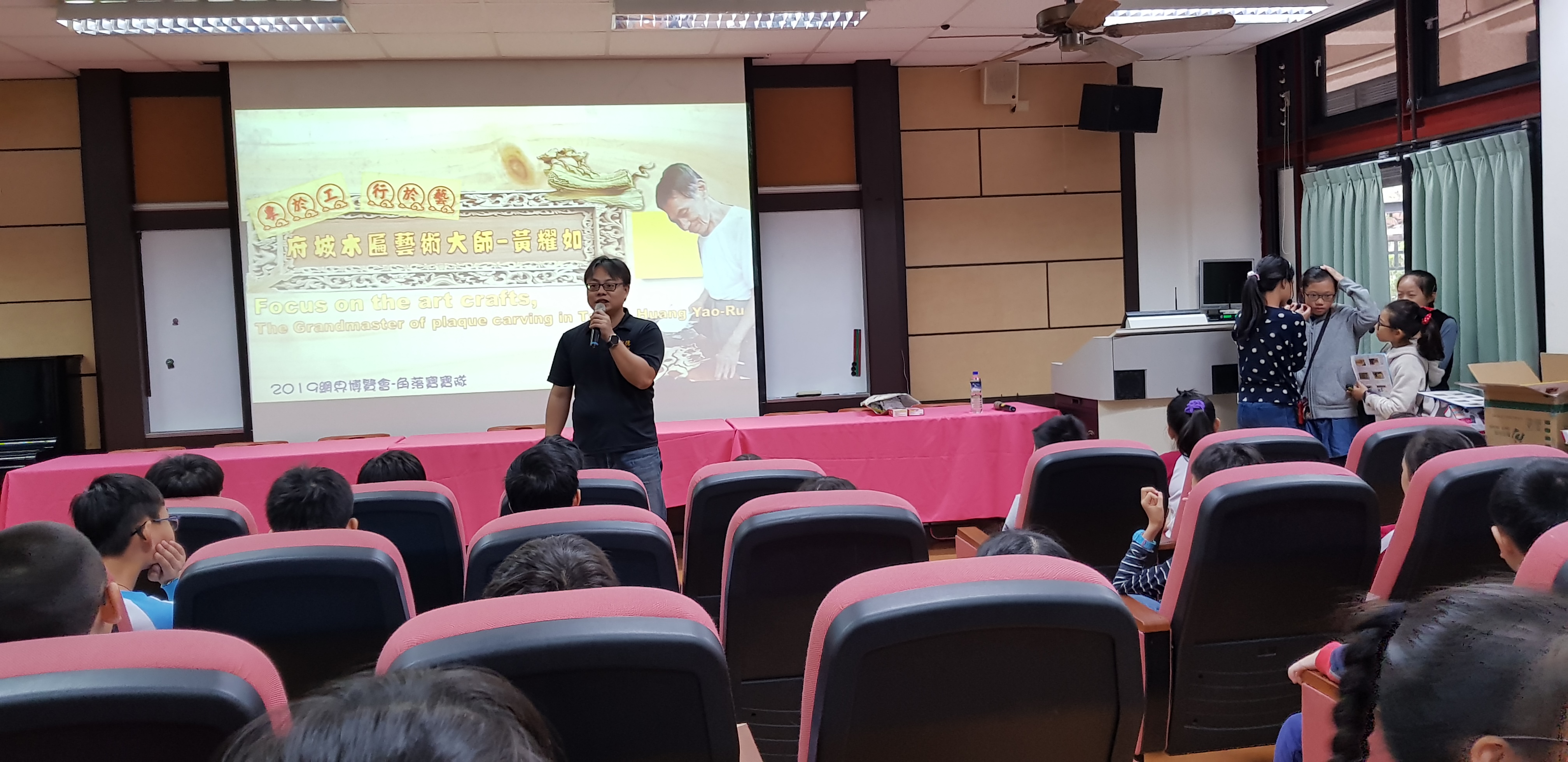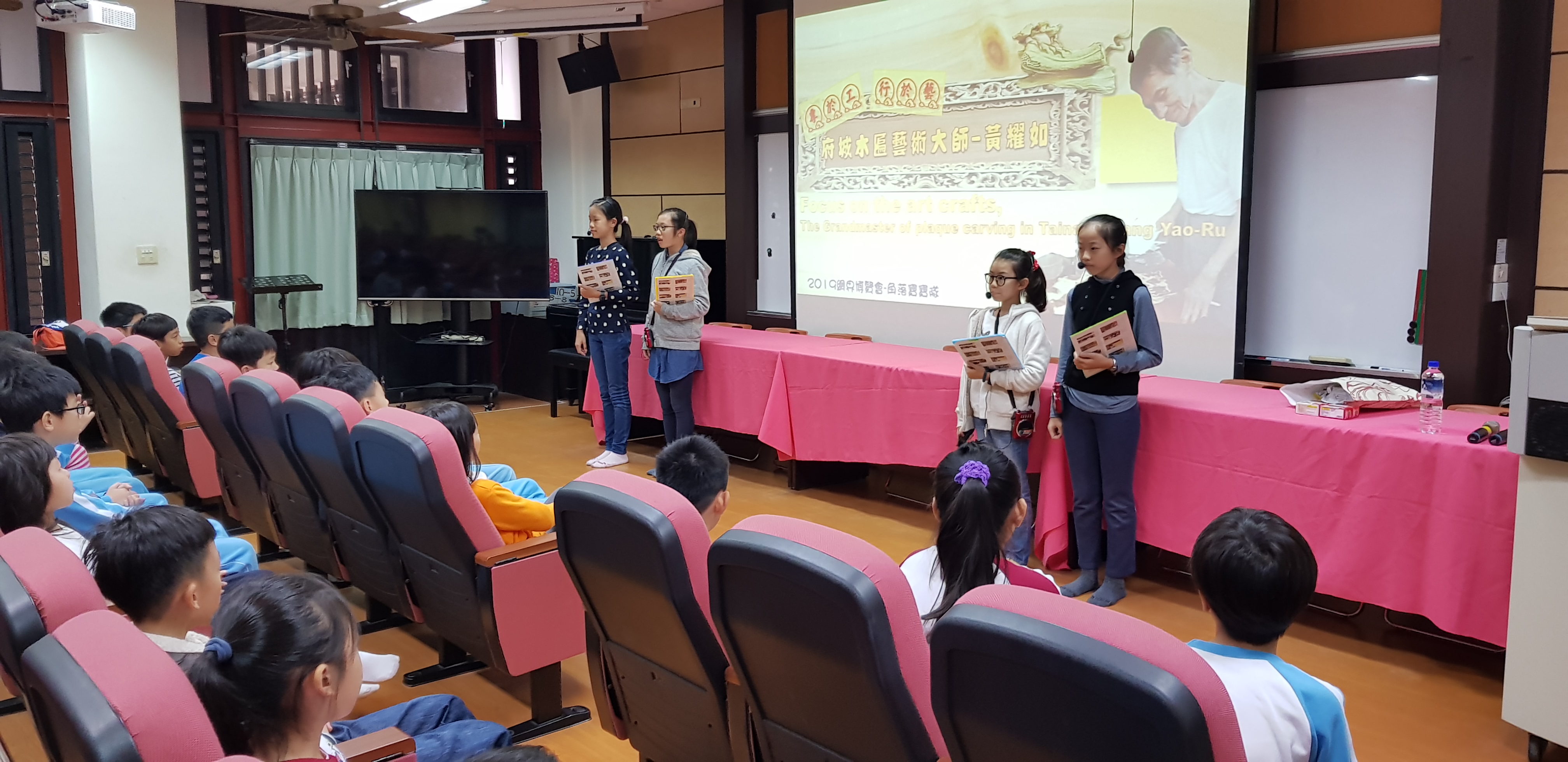 很快地,星期五這天就到了,我們利用學生朝會時間,向大家介紹及推薦這位擁有高超傳統技藝,卻低調不愛出名的國寶級大師黃耀如老師傅,平時我們笑嘻嘻的,今天看到一堆聽眾,也難免緊張了起來,我們感謝學校的教務主任林德宗主任為我們開場:「我們學校有一個學生團隊叫做角落寶寶隊,他們最近在研究一位八十幾歲的國寶級木匾工藝大師,現在就讓我們以掌聲歡迎他們來做一場簡報介紹。」,隨後我們的表現也很nice達到了該有的水準,只是因為緊張,講話還是快了些!不過這是很不錯的經驗…