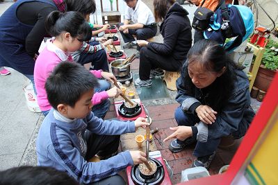 接近中午時,我們一夥人朝「保哥黑輪」出發,準備品嘗有名的炒泡麵,老板人很好,接受了我們的邀請,同我們一起合照,我們不僅吃午餐,還仔細觀察了煮法