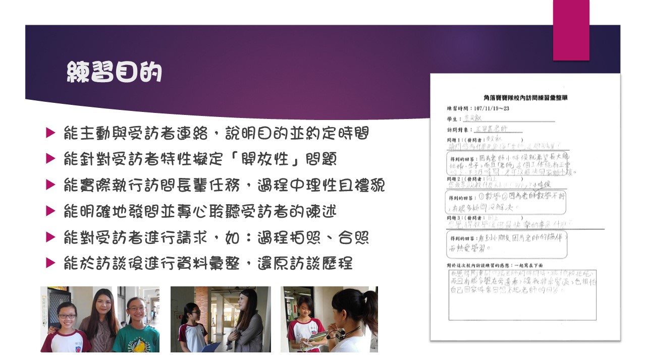 今天的小組集會主要是檢討一下上週的校內訪問小任務,老師說給大家這份練習的用意是: