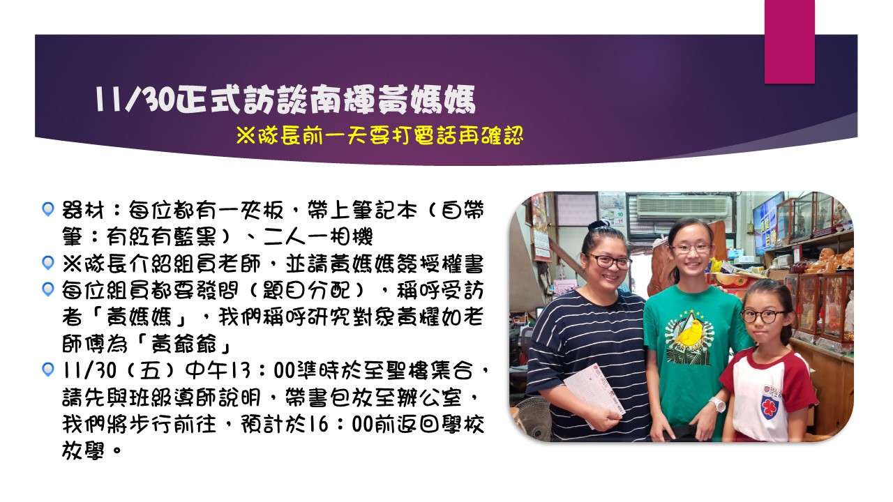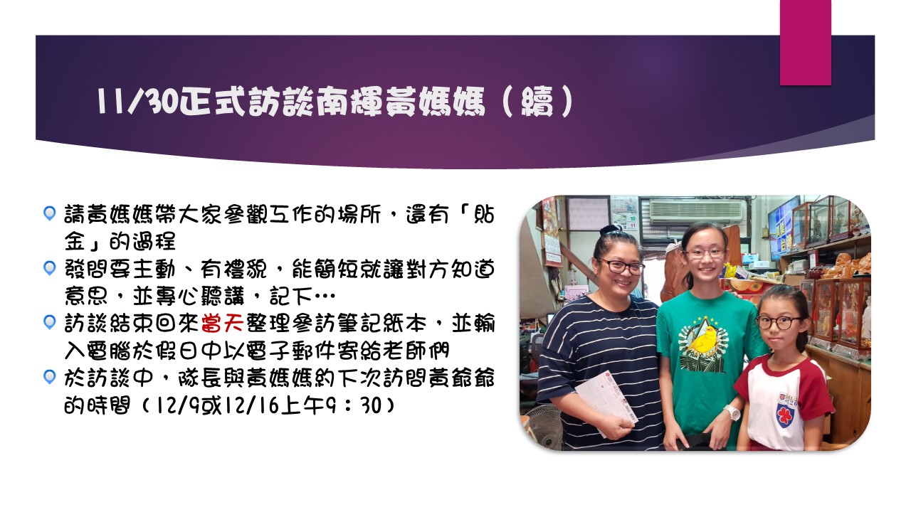 主要由大家自己檢核自己是否有做到,在這個過程中有沒有什麼獲得,而這是為了下週要到南輝木匾雕刻處的參訪做準備,今天最後的時間便是老師將收來的組員提問問題做了一些篩選及組合,最後擬定了18個參訪題目,每位小朋友分配到二題,老師請大家回去後利用時間,看一下自己的題目敘述,自己練習說說看。還有老師交待了下週拜訪黃媽媽的一些流程及注意事項,請大家記住了