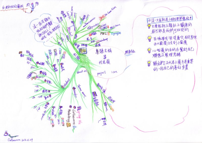 2.現在要大家畫出我們自己計畫的心智圖可能會有些困難,所以這一份大家慢慢畫,隨得我們小組討論的進行,擴充自己的圖…