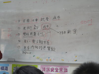 3.今天老師有發下幾本書,請大家看,之後交換輪流看,星期五的小組討論時要請大家提出那些是值得我們研究的地點(當然地點要符合我們主題的範圍:學校步行20分鐘內、具特色的老屋、有特色的餐飲),看書只是其中一種方法,你也可以去google或問人,而且 各位所查知的資料不可以只是陽春地說個店名,應以word或ppt整理成報告的樣子,然後mail給你的小隊老師看。或者你平時不方便使用電腦,也可以寫筆記本上,於小組討論時一起提出來。