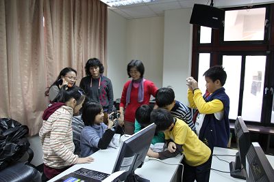 首先讓四年級的小朋友對數位相機的操作有更深入的認識,老師準備了全新還未拆封的數位相機,讓小朋友們從頭學習,從開盒、看說明書,放電池…一切自己動手,有別以往大人們總將東西設定好給他們使用,這樣應該才算真懂操作數位相機了!