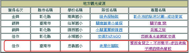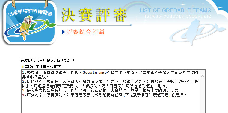 我們這次的作品「踅而食習之,不亦樂乎~走訪老房子裡的特色餐飲」已經通過互評,進入決賽,大會公告的網址如下:http://cyberfair.taiwanschoolnet.org/system/Workroom/ViewTeamList_IntoCountry1.asp?Grade_Type=1