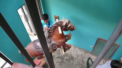 後面有一座旋轉樓梯、一隻旋轉木馬,有種低調的華麗。 還有小後院,青綠色的草地,配上餐桌椅,有田園的fu~喔 |