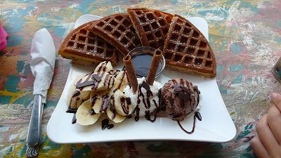 這是我點的香蕉巧克力鬆餅,還有附冰ㄝ! 香蕉、奶油和冰都可以做鬆餅的配料~搭配冰淇淋時, 融化的冰會慢慢流入鬆餅的格子裡,每一口都吃得到喔! 看了就流口水...... |