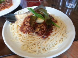 今天我和爸爸媽媽三人點了不同的餐點,媽媽的是早午餐,我和老爸點了義大利肉醬麵(我的原味,老爸的加了紅酒),此外老爸又點了咖啡,品嚐的結果,我們一致覺得:好吃! |