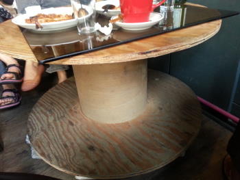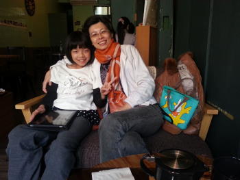 吃著、吃著,我們還發現當成桌子的原來是工程電纜用的捲軸,真是廢物利用的好榜樣,在這兒吃點東西喝杯飲料,聊聊天,果然就能感覺得到悠閒,最後跟老媽來張愉快的合照。 |